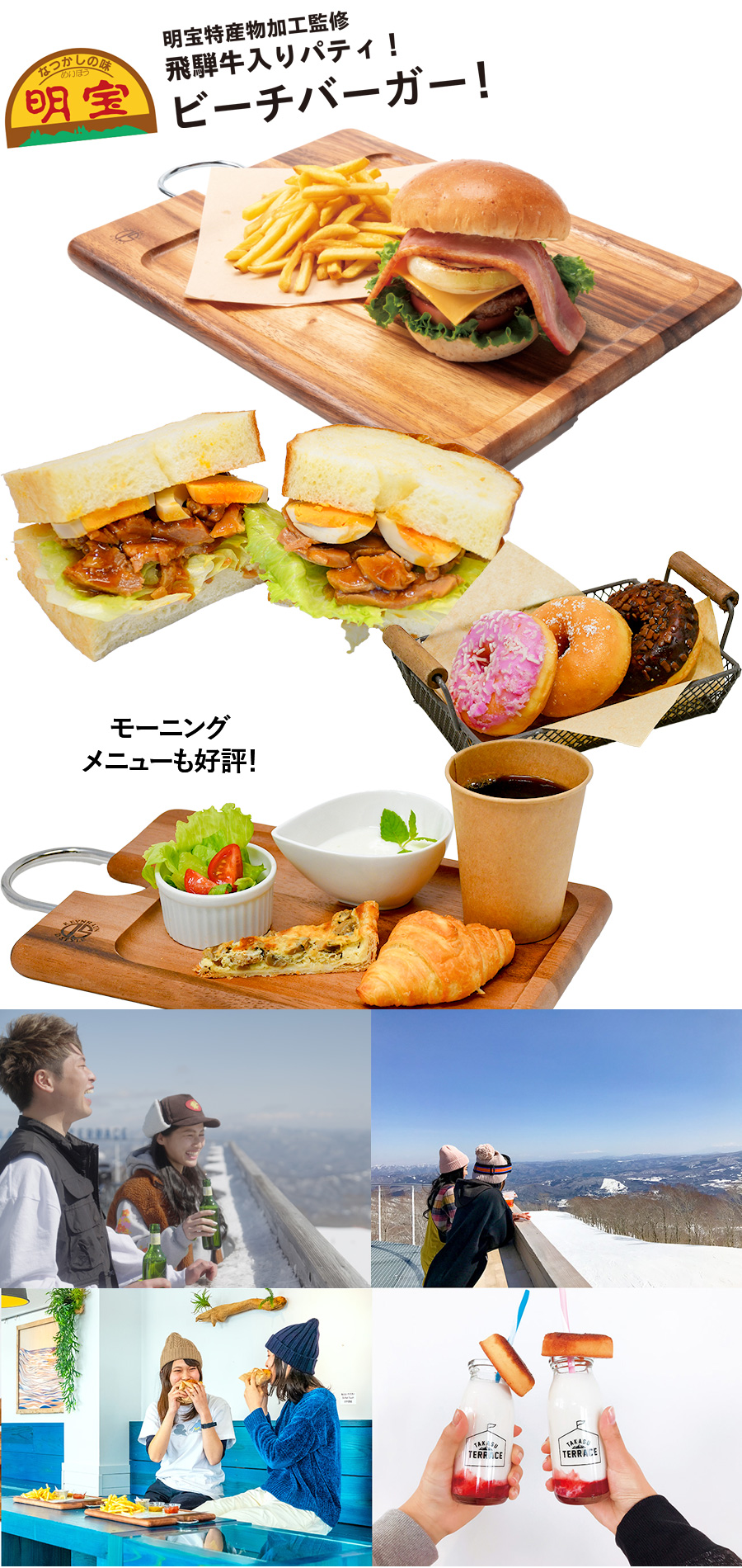 広々とした店内でゆったりとカフェを満喫!カウンター席、テーブル席、ベンチシート、ソファなどセクションごとに異なる雰囲気をお楽しみいただけます。 大人気メニュー「ビーチバーガー」は地元企業がパティを監修。さらに美味しくバージョンアップ!ひるがの高原牛乳や見た目もグッドなドリンクメニューも豊富です。