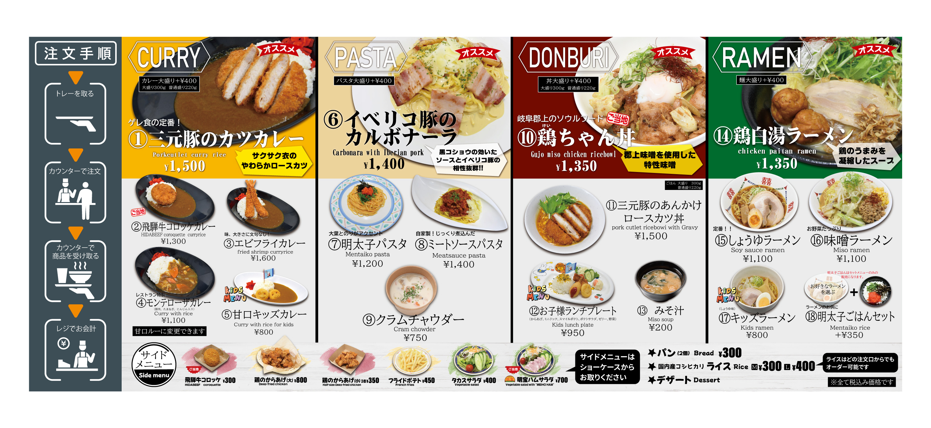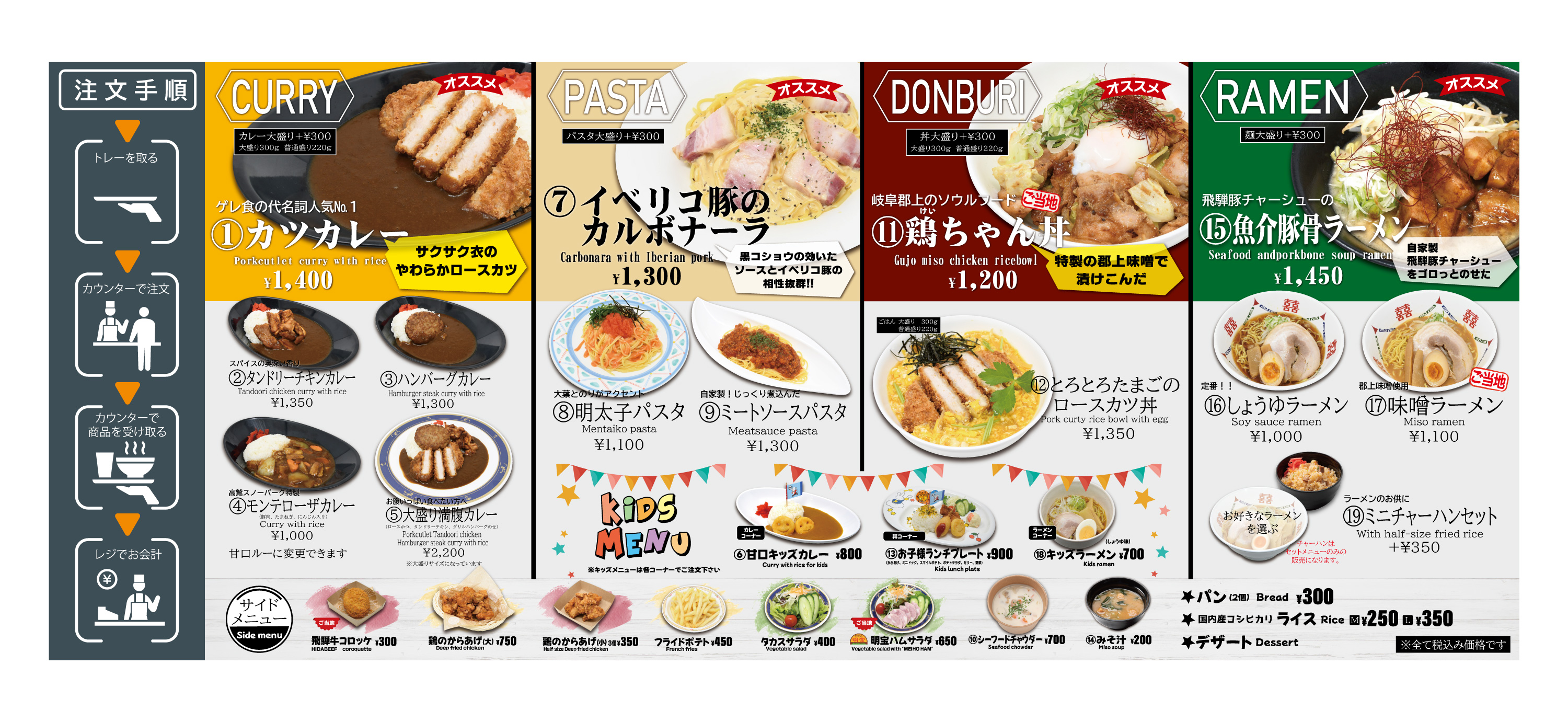 定番のカレー、ラーメン、どんぶり系から洋食、中華、地元のB級グルメまで多彩なバリエーションをご用意!